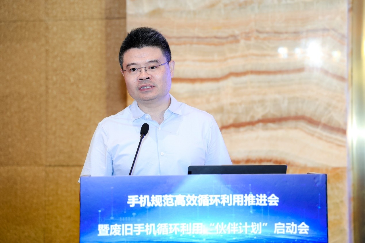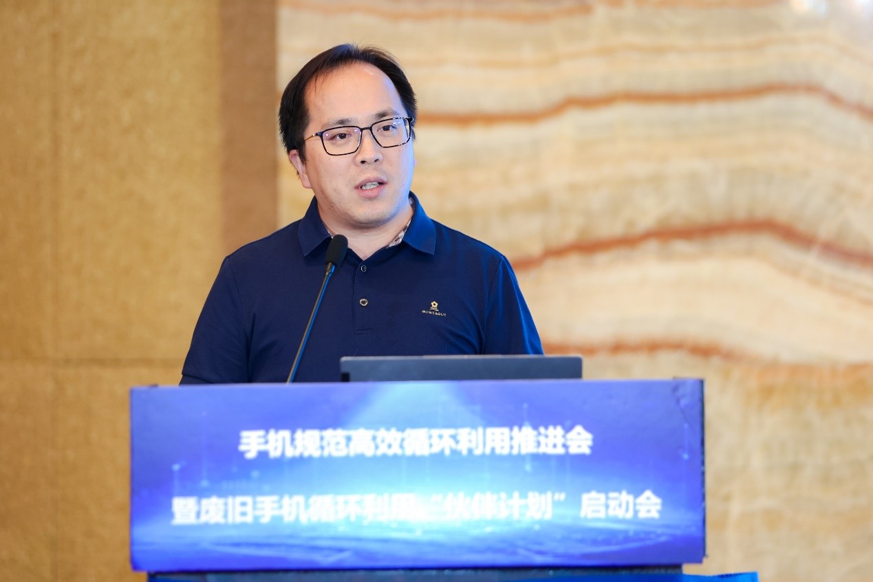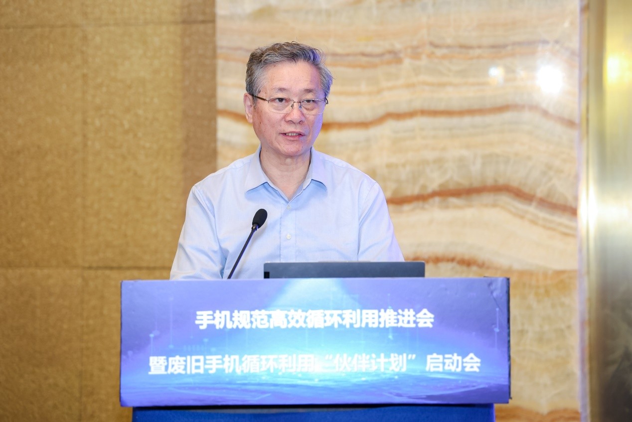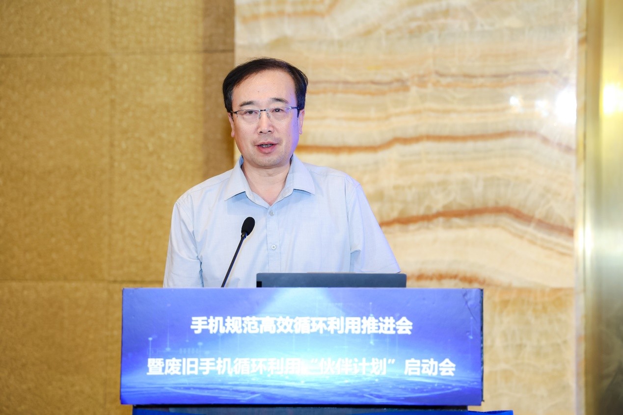 朱黎阳会长为会议致辞。他在致辞中指出,党中央、国务院高度重视资源循环利用工作,将资源循环利用纳入国家战略体系统筹推进,“伙伴计划”对加强废旧手机循环利用产业协同,畅通产业链条,推动资源循环利用具有重要意义。他表示“伙伴计划”汇聚政府、企业及社会力量,通过加强产业协同、开展政策研究以及推动标准引领三大核心行动破解行业瓶颈。最后他呼吁各方以伙伴计划为起点,用技术提升价值,用标准守护安全,共同构建规范高效的废旧手机循环利用体系,为推动我国资源安全、绿色发展以及双碳目标的实现做出更大贡献。