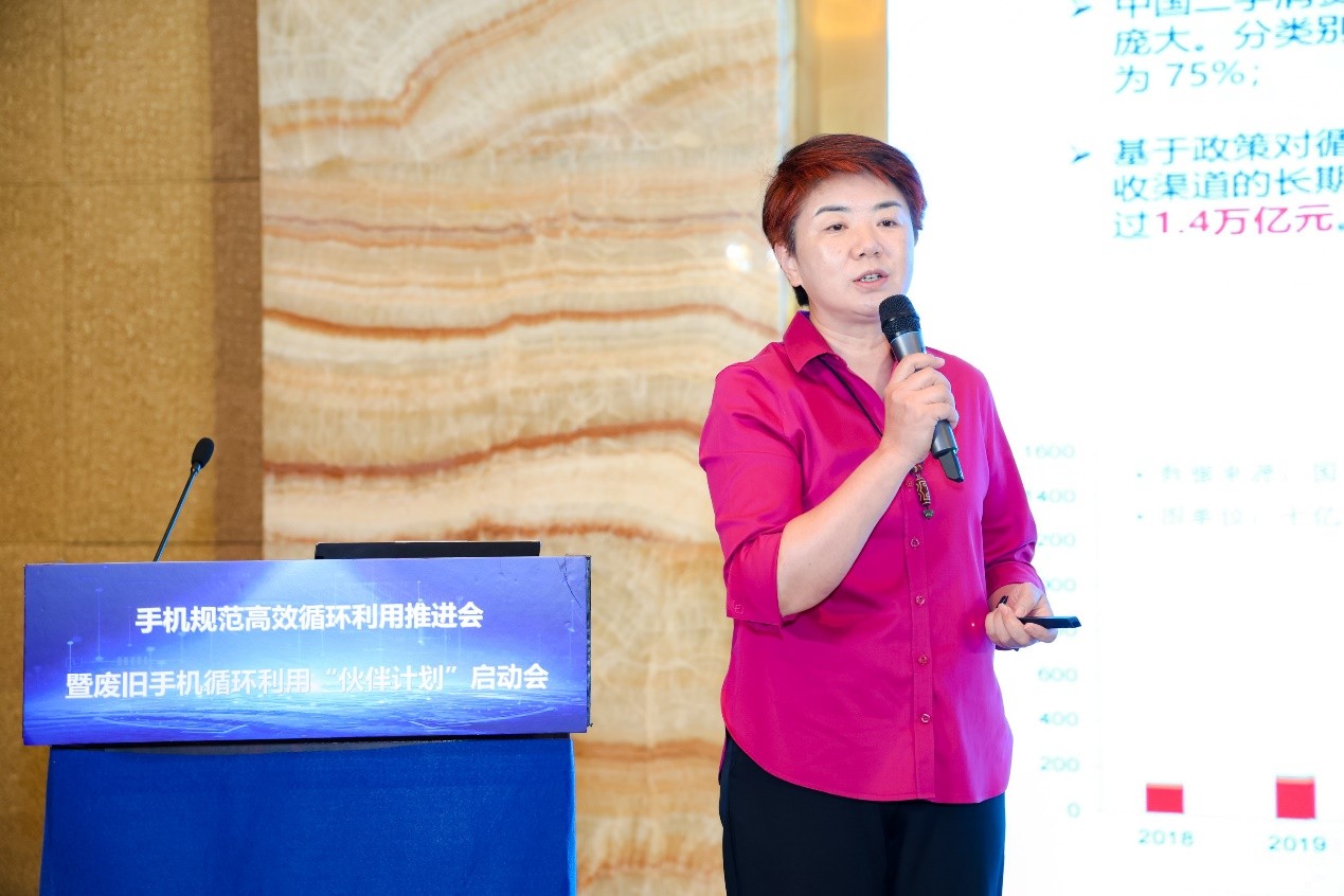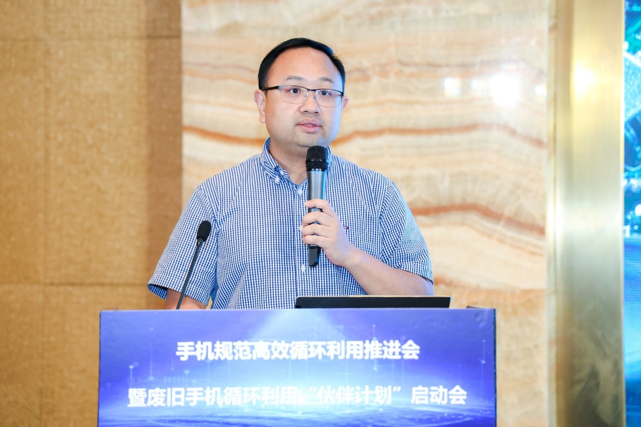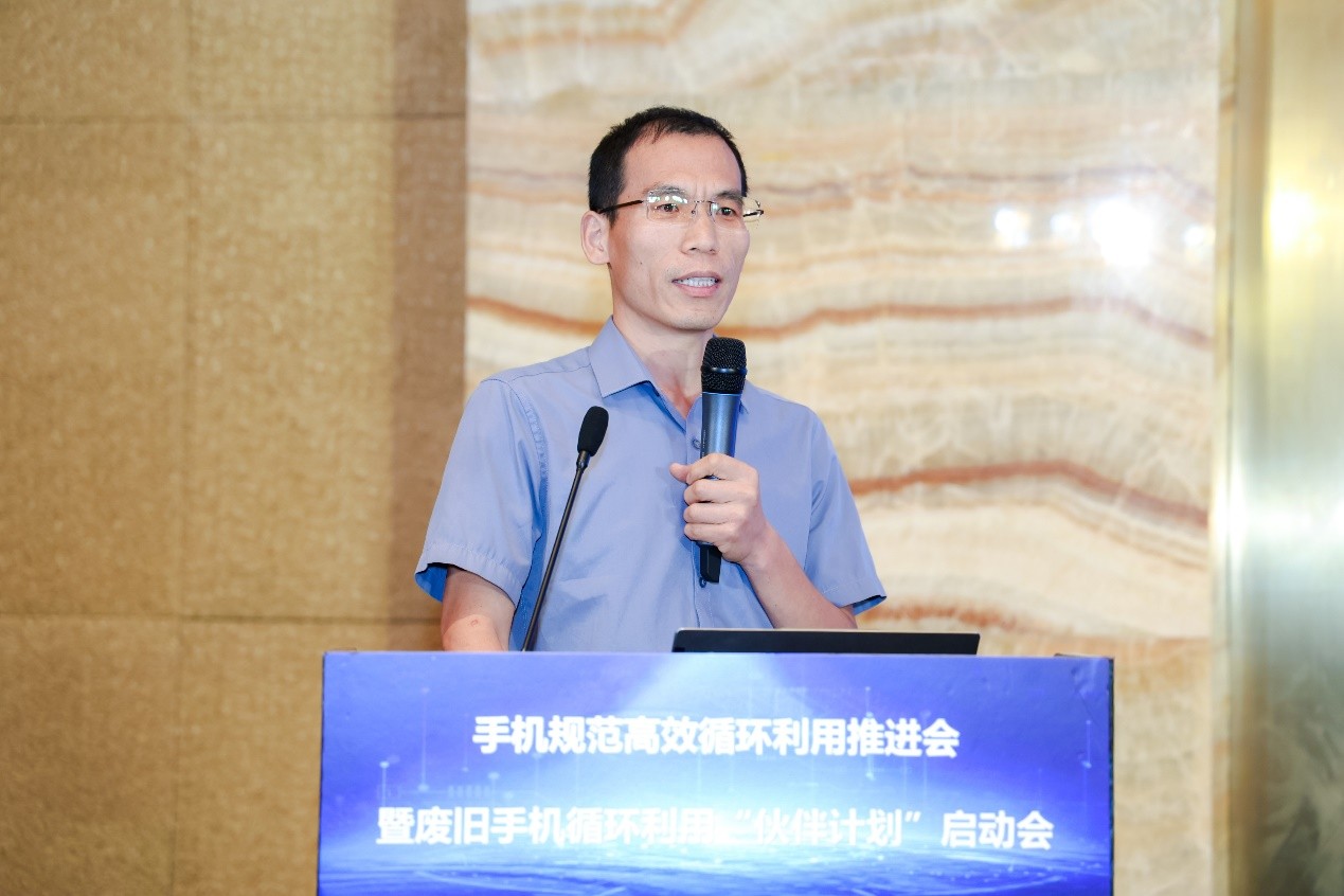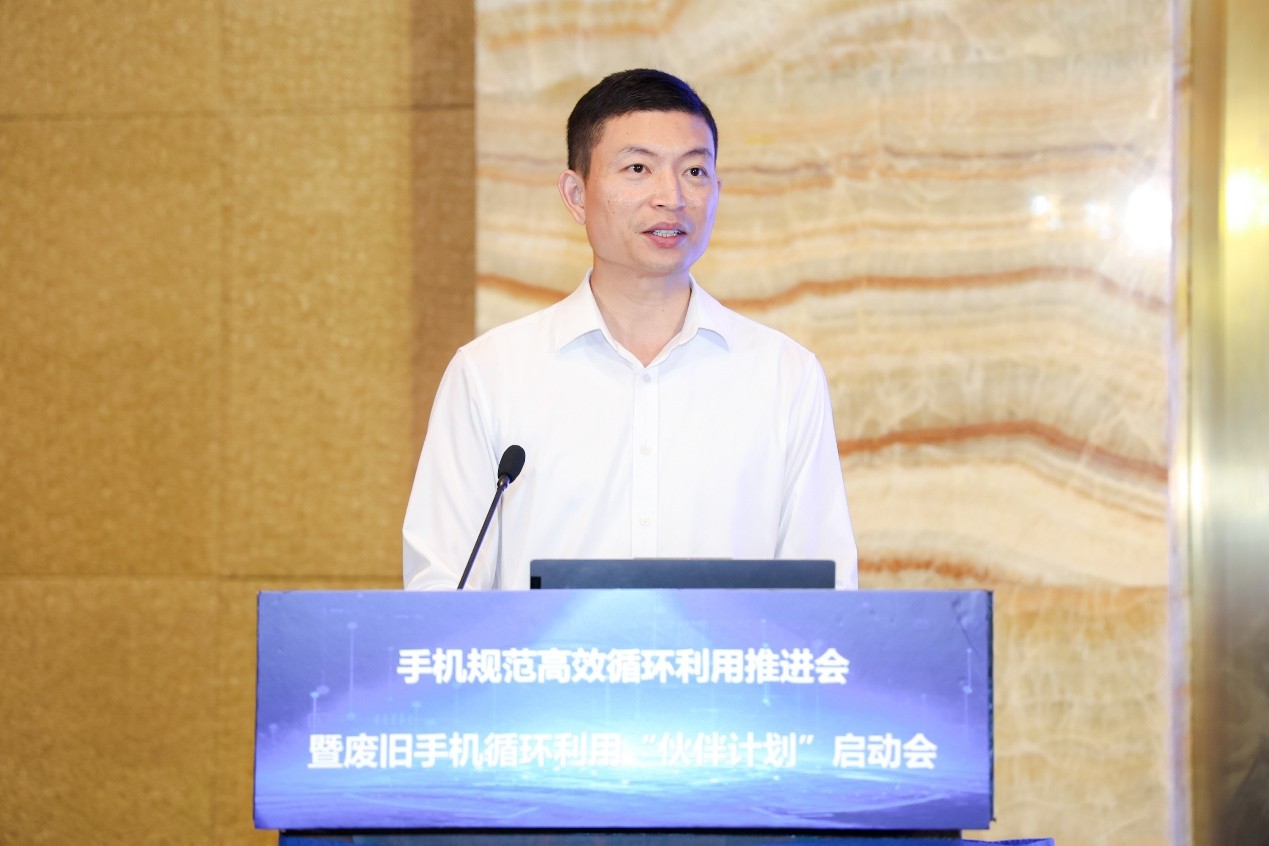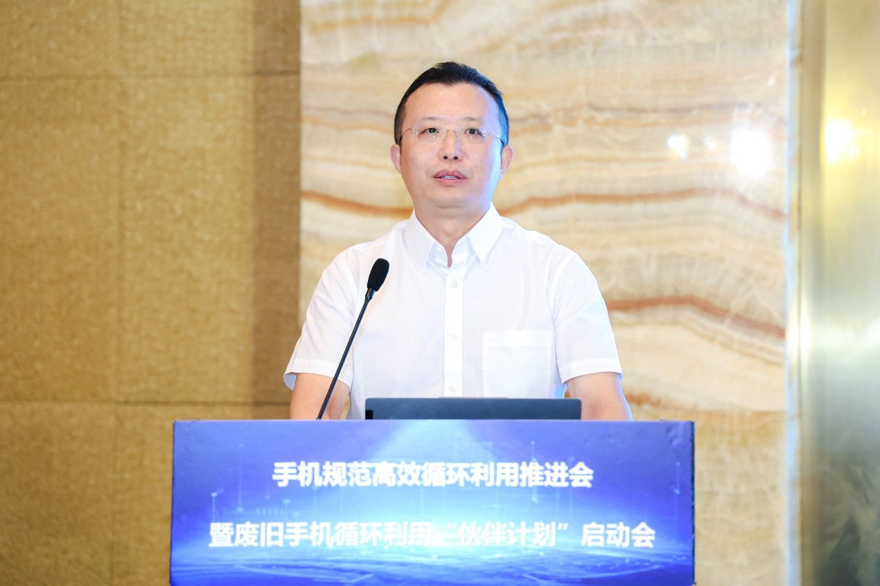 朱黎阳会长为会议致辞。他在致辞中指出,党中央、国务院高度重视资源循环利用工作,将资源循环利用纳入国家战略体系统筹推进,“伙伴计划”对加强废旧手机循环利用产业协同,畅通产业链条,推动资源循环利用具有重要意义。他表示“伙伴计划”汇聚政府、企业及社会力量,通过加强产业协同、开展政策研究以及推动标准引领三大核心行动破解行业瓶颈。最后他呼吁各方以伙伴计划为起点,用技术提升价值,用标准守护安全,共同构建规范高效的废旧手机循环利用体系,为推动我国资源安全、绿色发展以及双碳目标的实现做出更大贡献。