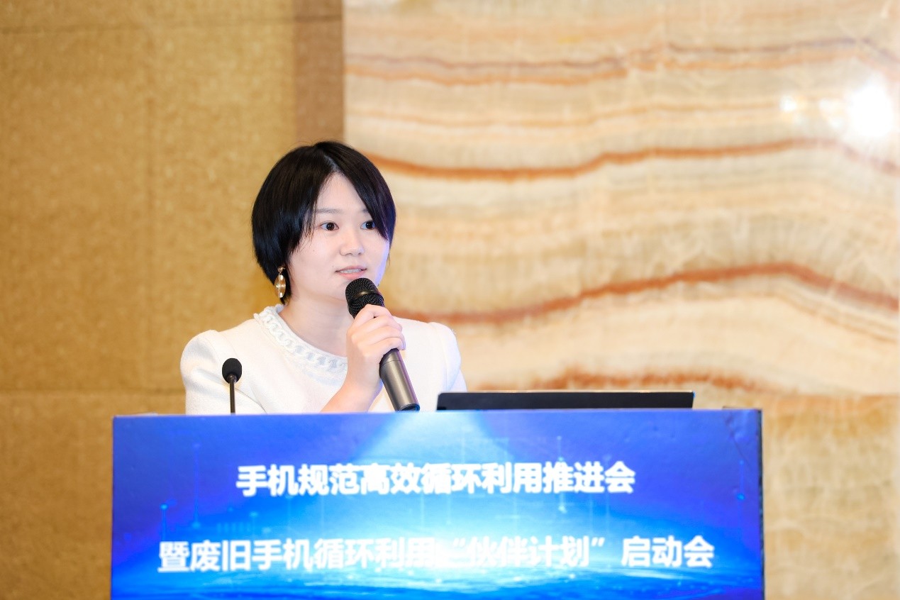 中国移动通信集团终端有限公司市场部总经理许倩做了《推动手机循环利用,共筑绿色通信未来》的主题报告,介绍中国移动勇担“三个主力军”使命,锚定世界一流目标,在网络规模、ESG表现和技术创新上持续领先,推动手机循环利用、共筑绿色通信是公司战略重点。他表示,中国移动将持续投入资源,发挥用户与渠道优势,推动循环经济标准优化与落地。最后,他强调,循环无界,未来可期,中国移动愿携手伙伴,共同书写循环经济的“中国答卷”。