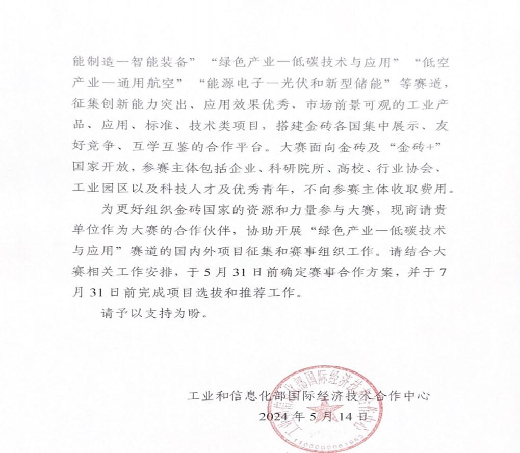 为贯彻落实习近平总书记在金砖国家领导人历次会晤上的重要讲话精神,扎实推进金砖国家新工业革命伙伴关系建设,促进金砖国家工业创新领域务实合作,2024金砖国家工业创新大赛(BRICS Industrial Innovation Contest 2024)(以下简称大赛)于2024年5月正式启动,大赛已连续举办四届,面向全社会挖掘、征集创新能力突出、应用效果优秀、市场前景可观的技术项目,为伙伴关系创新合作和人才培养营造了积极氛围,大赛推荐入围项目将入驻金砖国家新工业革命伙伴关系创新基地和“金砖国家工业创新合作项目库”,享受最新创业扶植政策和创业孵化服务,加速实现产业化。本届大赛由金砖国家新工业革命伙伴关系创新基地,工业和信息化部国际经济技术合作中心主办。