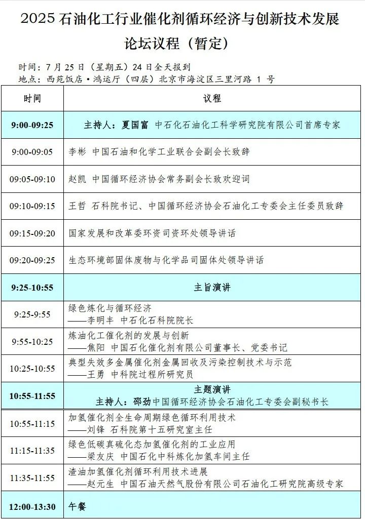 为了方便技术交流,促进行业互鉴互促,本次交流会后中文核心期刊《石油炼制与化工》(CN11-3399/TQ)编辑部将出版《2025石油化工行业催化剂循环经济与创新技术发展》论文集,欢迎各单位有关专家和技术人员根据论坛主题积极投稿,要求见附件3投稿要求,截稿日期2025年8月31日。