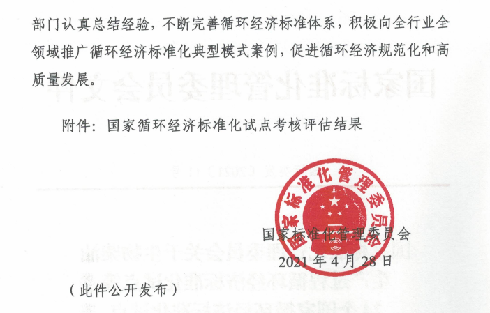 按照 《循环经济标准化试点工作指导意见》 (国标委工一联〔2009〕48号)、《国家循环经济标准化试点考核评估方案(试行)》 (国标委工一联〔2011〕 12号)有关要求,经考核评估,确定“生物柴油生产过程循环经济标准化试点”等21个国家循环经济标准化试点考核评估合格,“造纸业节能减排循环经济标准化试点”等3个国家循环经济标准化试点终止。请你们和相关部门认真总结经验,不断完善循环经济标准体系,积极向全行业全领域推广循环经济标准化典型模式案例,促进循环经济规范化和高质量发展。